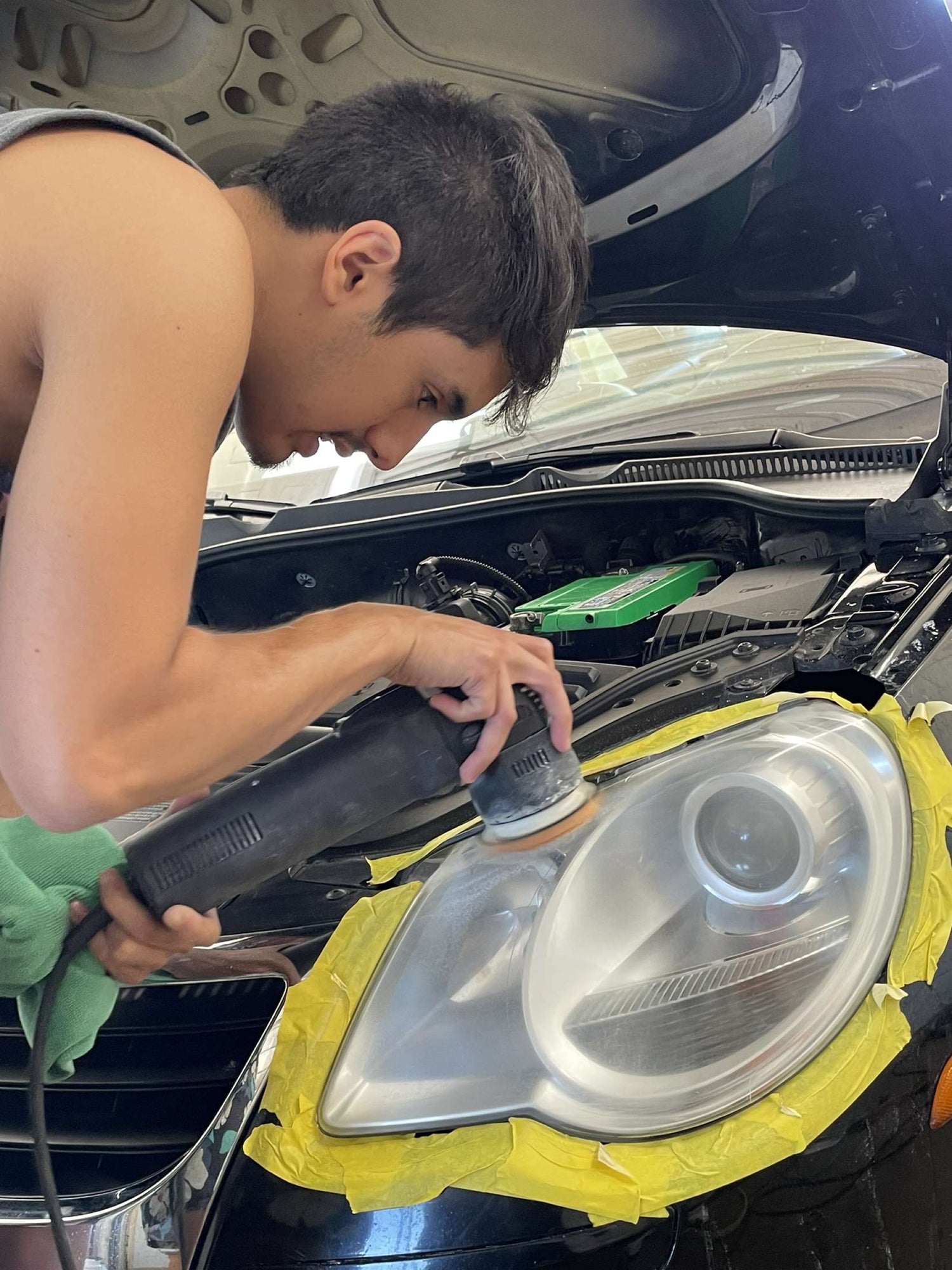 - Thorough cleaning and clay bar of the headlights to prep for polish